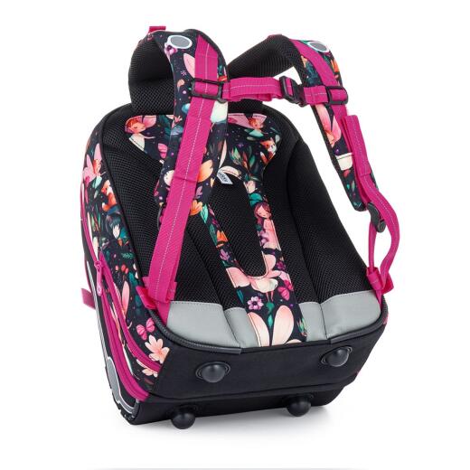 Tornister ma usztywniane, profilowane plecy z lekkim stelażem, które wspierają prawidłową postawę dziecka oraz wygodne miękko wyściełane szelki łatwo dopasowujące się do sylwetki. Dzięki stabilnej konstrukcji plecak dobrze trzyma kształt.