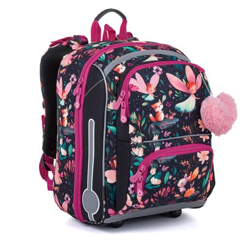 Model BEBE to hybryda klasycznego tornistra i plecaka szkolnego. Jest odpowiedni dla małych dziewczynek o wzroście od 110 cm. Urocze wróżki i leśne zwierzęta ozdabiające tornister wraz z puchatą przywieszką są przesłodkie.