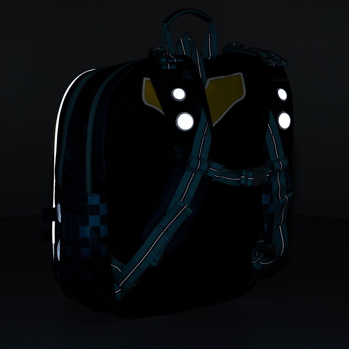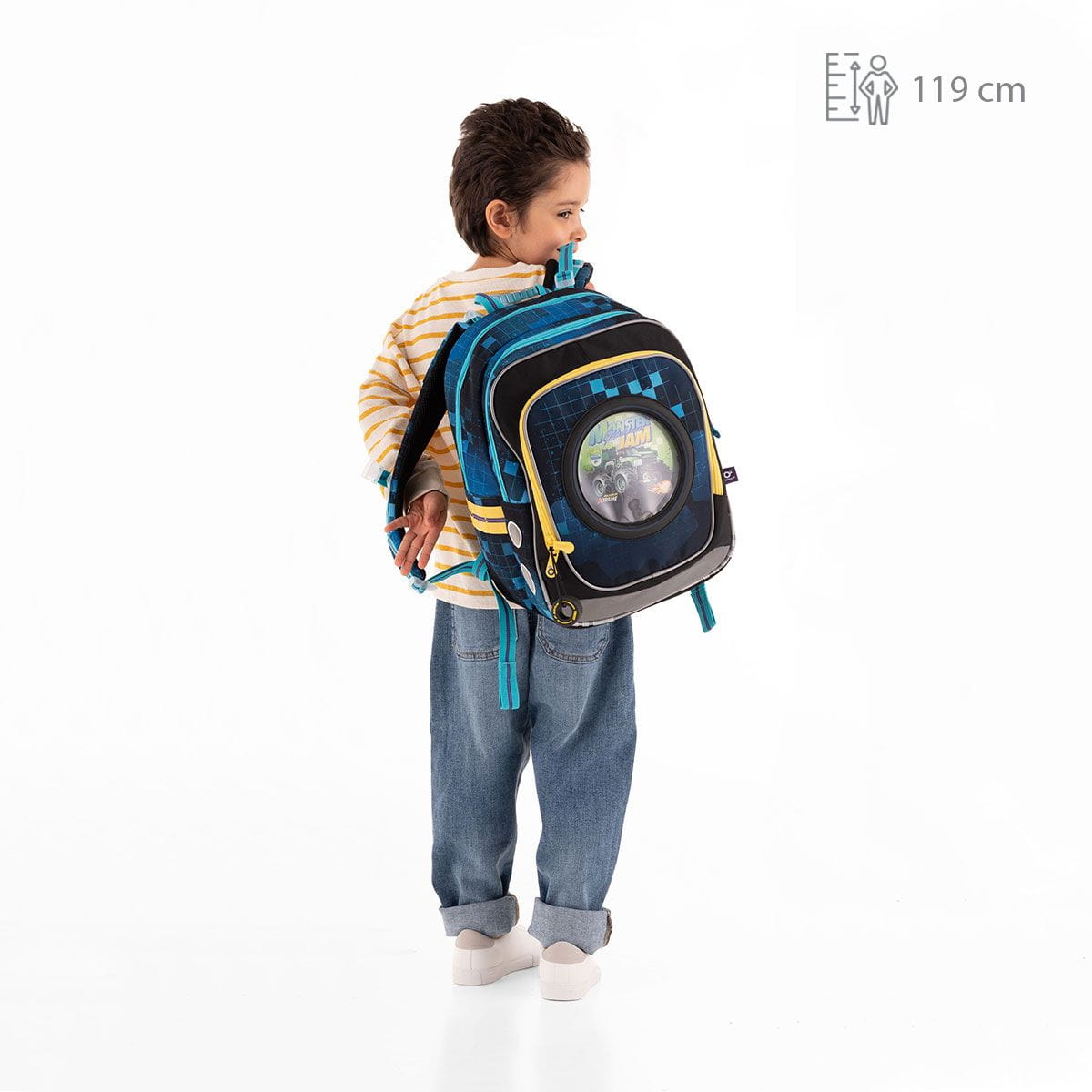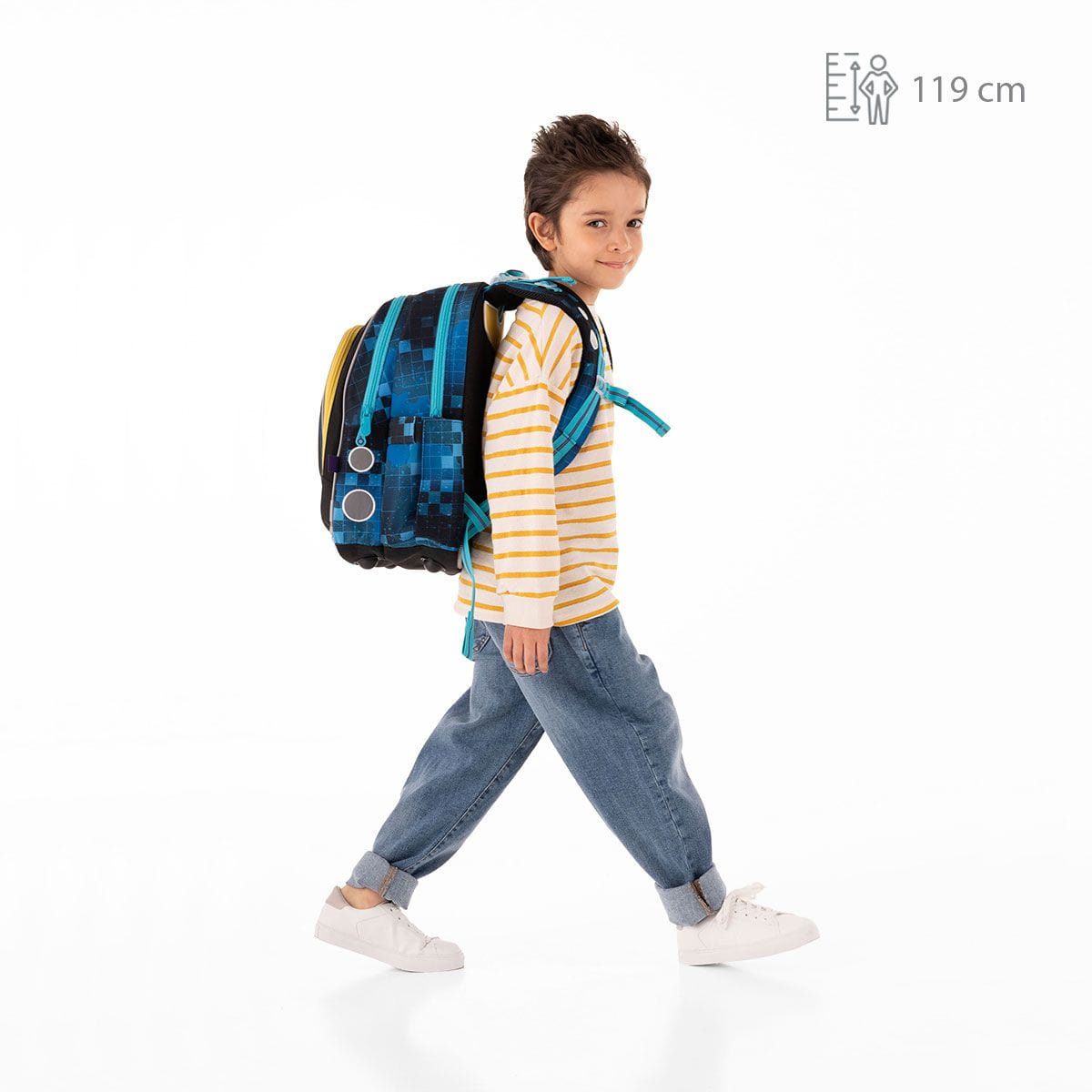 Dzięki dwóm pojemnym komorom plecak posłuży co najmniej do 3 klasy. Jest bardzo lekki, nie waży nawet kilograma. Polecamy go dla dzieci od 120 cm wzrostu. Tylna część plecaka jest utworzona z utwardzanej pianki, jest sztywna. Dzięki temu plecak jest lekki. Szelki w plecaku są anatomicznie wyprofilowane i mają podwójną regulację - górną i dolną oraz pas piersiowy. Dzięki temu można dopasować plecak do indywidualnych potrzeb dziecka.